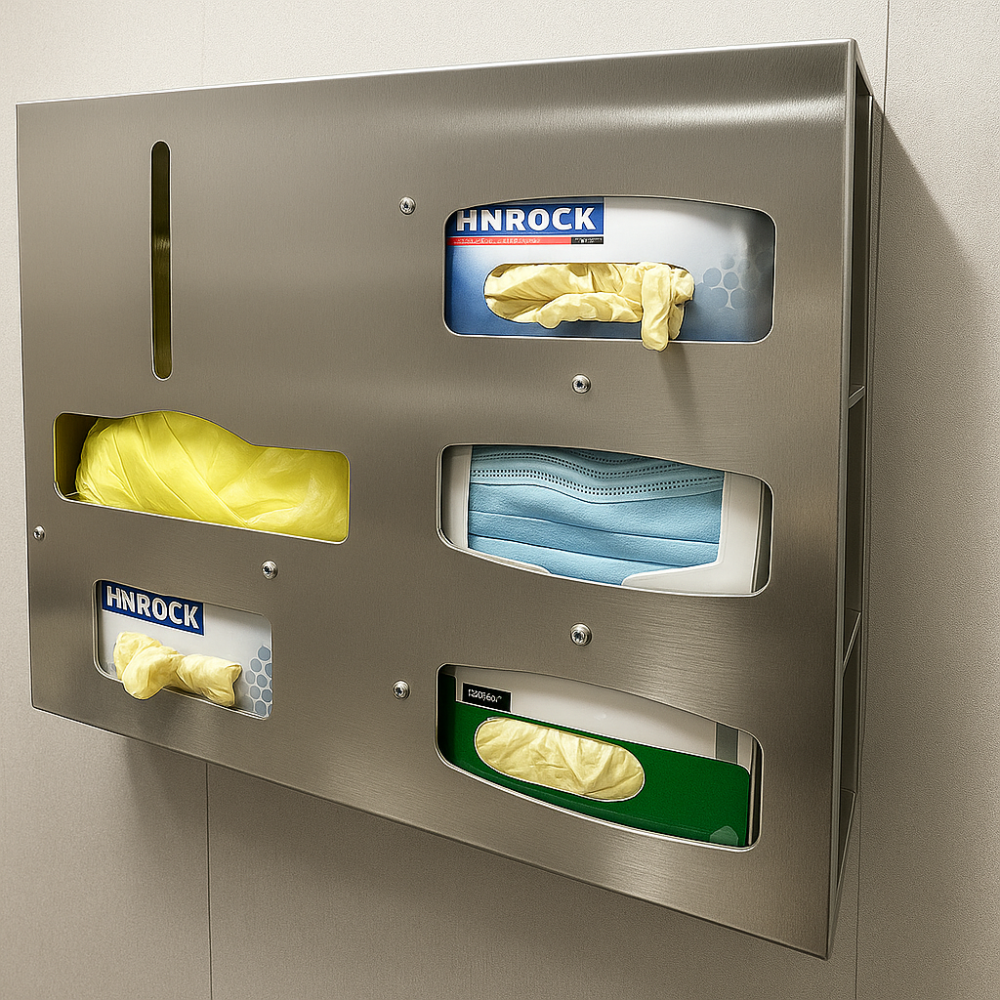 حامل معدات الوقاية الشخصية متوسط الحجم يوفر حلاً عمليًا لتنظيم القفازات، الكمامات، أغطية الرأس والمطهرات في مكان واحد.