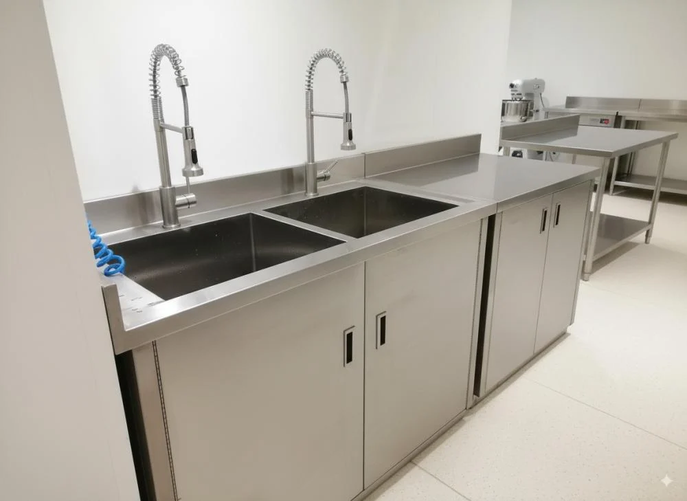 حوض غسيل مزدوج ستانلس ستيل 304 للمطابخ التجارية والمختبرات بضمان 3 سنوات